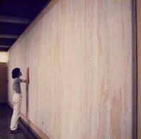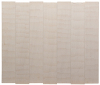 フレスコ*でパネルに制作された作品。画廊の壁面3面を取り囲むように10枚のパネルで構成された。この作品では、フレスコ特有の技法上の制約を画面構成上の必然性として、1枚のパネルが6日分に分割して仕上げられている。不定形に塗られた壁面区画(ジョルナータ)の縁に添って、テラ・ロッサ(土性の赤茶色)によるハッチィング(線描)が、色がつかなくなるまで繰り返される。こうした単純な作業の積み重ねの内に、砂漠の風紋のような、木目のような、有機的なグラテーションとリズムが現れる。