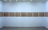 学部4年次に「芸術祭」で発表した作品。 横長の薄いベニヤ板に半透明の和紙を貼った1枚を1単位として、表面に白のハッチング(雨降り描き)を絵の具が切れるまで施す。ハッチィングによって生じるグラテーションと、和紙を透かして見えるベニヤ板の木目が重なり、描かれた白い調子と背景のベニヤの色が互いに交替し合う。1単位を1日で仕上げ、1週間(7枚)ごとに少しづつずらしながらパネルにまとめ、さらにパネル7組を連続させて展示した。