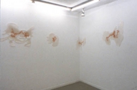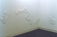 前掲同様の点描による作品だが、支持体に石膏を用いた。毎日一定量の石膏を流して出来た不定形の限定面に同様の点描を施し、渦巻き(波紋)が次々に移動していくことにより、画面(石膏)も増殖、拡張していく。すなわち、点描が残した軌跡と画面全体が同一の構造で出来上がっている。渦巻き及び石膏面が内側に回り込み逃げ場を失うことにより、一連の作業は一個の作品として完結することになる。展示においては、一つの作品において点描が終了した点の高さを、隣の作品における中心点の始まりの高さに設定して、一連の作品の連続性を確保し、壁面インスタレーションとして統一された。