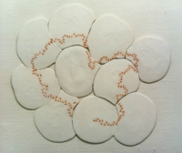 シナベニヤ板を下敷きに、半透明の和紙(雁皮紙)に水彩絵の具(白色)で点描が施してある。写真(上)は1枚づつの作品シリーズ。1枚ごとに紙の中心から点を打ち始め、渦巻き状に絵の具が途切れるまで描き続ける。絵の具が途切れた時点で新たに絵の具を補い、その点を中心に次の渦巻き(波紋)を描いていく。この繰り返しにより、中心をずらしながら画面上を渦巻きが「虫が這うように」移動して行くことになる。画面(和紙)の端までで1枚ごとに完結させたのが写真(上)のシリーズ。写真(下)は、渦巻きの移動に合わせて上下左右に画面(和紙)を繋いで展開させた作品である。