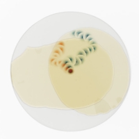 留学したデュッセルドルフ美術アカデミーの学年末展「Rundgang*」において、渡独後初めて発表したもので、透明なポリエステル樹脂をガラスに流して出来た不定形の限定面に、点描を行うことにより展開する作品。同様の作品をすでに日本で手がけていたが、美術アカデミーの建物の窓枠に合わせて制作された。ガラスのおもて面には赤色、うら面には緑色で点描されて、それぞれの移動の軌跡を空を背景に描いていく。