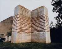 ヴッパータール近郊の小都市ゲーヴェルスベルグ市のモニュメント*。作品タイトル「Zeitschichten」は、訳せば「時層」となる。この地方特産の黄色い砂岩で一辺2mの立方体を取り出し、その塊を上下に2分した後、真ん中に同じ体積分のセメントの層を挿入する。赤白のストライプは白セメントと、砂岩に含まれている酸化鉄(赤色顔料)を交互に踏み固めて重ねて作られた。体積が倍になった直方体(高さ4m)の塊を縦にくさび(せり矢)で2分して、左右に開いた形で設置された(プランドローイング参照)。制作は、ゲーヴェルスベルグ市土木課の全面的な協力の下に行なわれた。この作品では、砂岩表面に見られる酸化鉄や石炭の縞模様と、制作日数分のストライプという自然および人為による積層された時間の相に対して、くさびにより割り開く瞬間的な時間の相を対比的に見い出すことが出来よう。