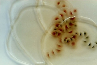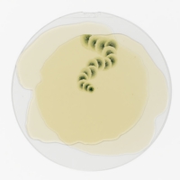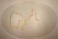留学したデュッセルドルフ美術アカデミーの学年末展「Rundgang*」において、渡独後初めて発表したもので、透明なポリエステル樹脂をガラスに流して出来た不定形の限定面に、点描を行うことにより展開する作品。同様の作品をすでに日本で手がけていたが、美術アカデミーの建物の窓枠に合わせて制作された。ガラスのおもて面には赤色、うら面には緑色で点描されて、それぞれの移動の軌跡を空を背景に描いていく。